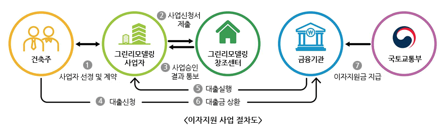- 민간건축물의 에너지 성능개선 촉진을 위한 공사(그린리모델링) 진행 시 은행에서 대출받은 공사비의 이자 일부를 보조하는 사업