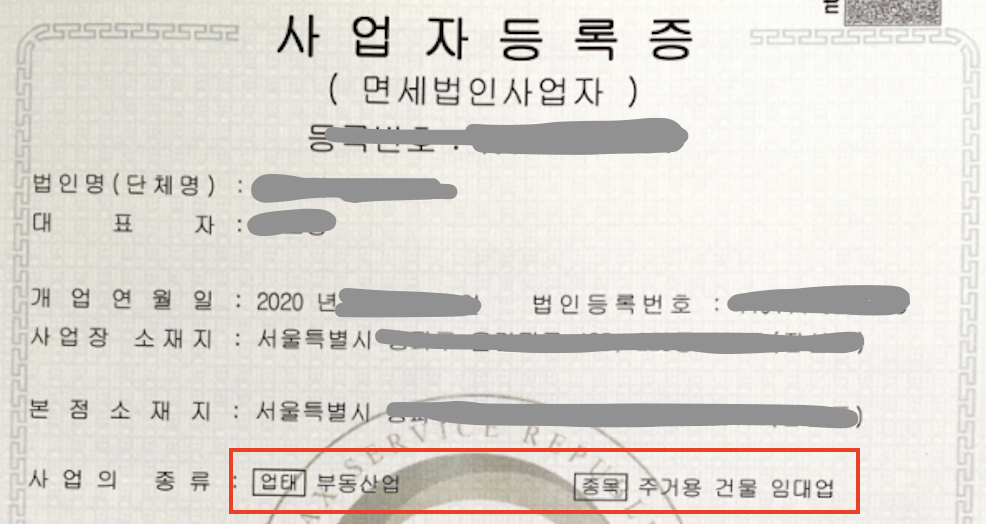 - 사업자등록증에 아래와 같이 부동산 임대업이 등록되어 있어야 합니다.