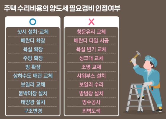 복합적으로 인테리어나 리모델링을 했을 때 전체 공사에 대해 계약하고 비용도 한 번에 결재하는 것이 보통이기 때문에 이런 경우 리모델링 금액 전체를 필요경비로 넣어 양도세를 신고하면 안 됩니다. 추후 국세청에서 비용인정을 받지 모해서 세금을 토해낼 수 있으니 전체 리모델링이라 하더라도 항목별 견적서를 참고해서 세무대인을 통해 필요경비를 각각 구분해 신고하시기 바랍니다.