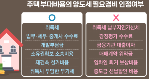 | 인정되는 것 | 취득세, 법무사 비용, 취득중계수수료, 국민주택채권 매각차손, 컨설팅 비용, 취득시 쟁송 비용 매수자 부담 양도소득세, 경락대금에 포함되지 않는 대항력 있는 전세보증금, 양도 중계수수료, 세무사 양도 소득세 신고 수수료, 자본적 지출 |