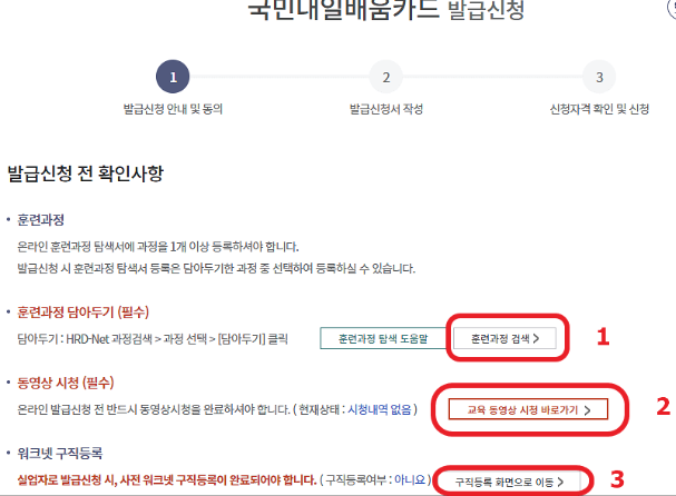 3) 아래와 같이 국민내일배움카드 발급신청에서는 3가지를 순서대로 완료합니다.