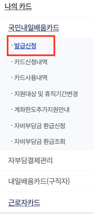 - [나의카드] 하위 메뉴의 [발급신청]으로 이동합니다.