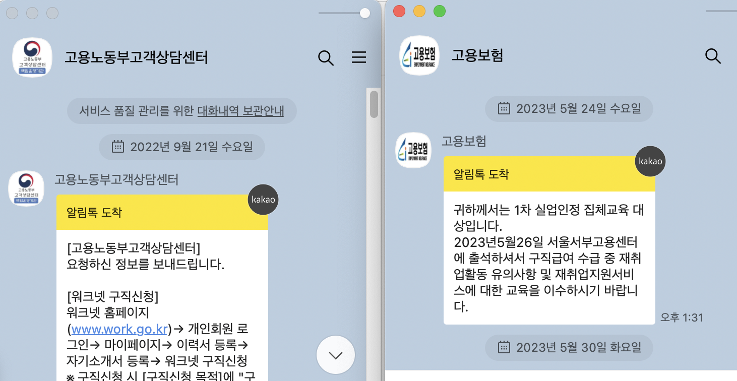 - 회사에서 이직확인서가 제출되고 퇴직일 이후에 실업급여 신청을 할 수 있다는 사실과 신청 철자를 알림톡(좌)으로 발송해 줍니다.