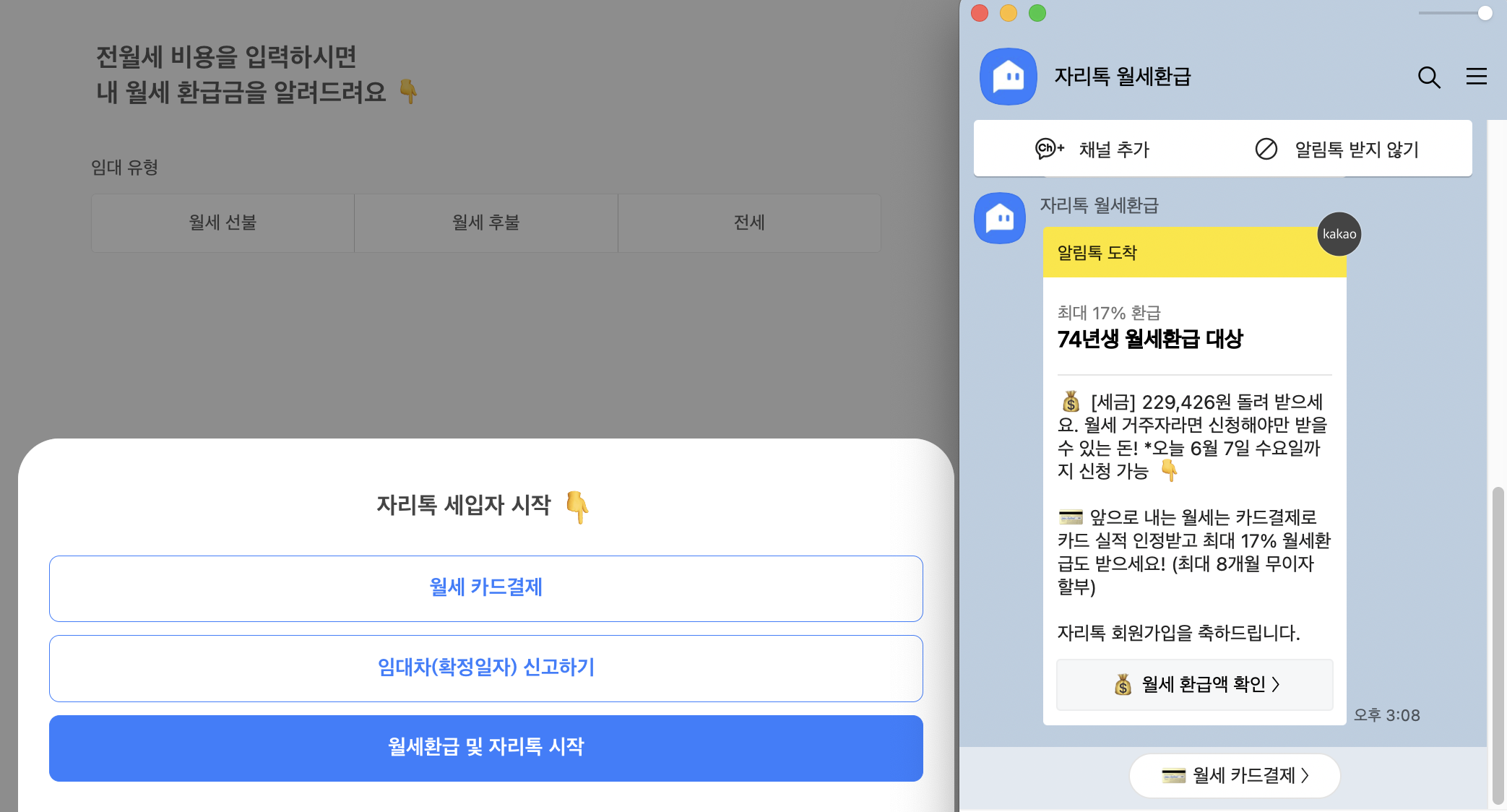 자리톡에서 임차인으로 로그인하면 아래와 초기화면에서 월세정보를 등록하면 됩니다. (회원가입 후 카카오 채널로 알람이 옵니다.)